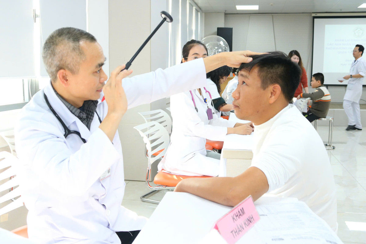 Bác sĩ Bệnh viện Bạch Mai kiểm tra sức khoẻ cho Thiếu tá Nguyễn Văn Chương. (Ảnh: Thế Anh)
