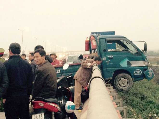 Chưa chịu dừng lại, chiếc xe tải kéo theo xe máy dưới gầm vào lan can cầu Thanh Trì. Chiếc ô tô này chỉ dừng lại khi đâm nát lan can cầu rồi thò hẳn phần cabin ra ngoài.