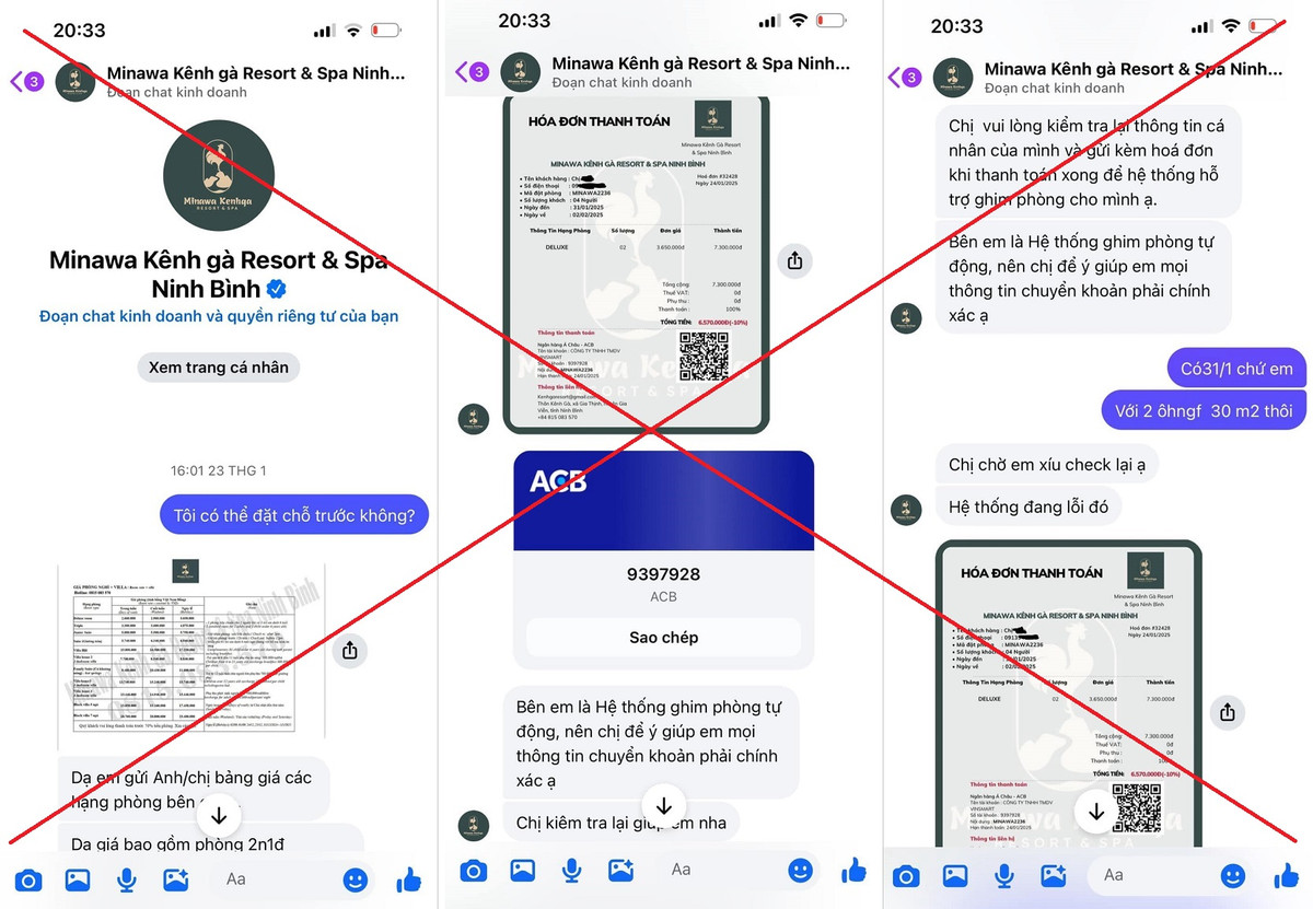 Thông qua vụ việc của chị V.T.T, nạn nhân mới đây đã mất cả tỷ đồng khi đặt phòng khách sạn trên fanpage Facebook có tích xanh mang tên Minawa Kênh gà Resort & Spa Ninh Bình, có thể thấy sự tinh vi của những đối tượng lừa đảo cũng như sự chủ quan của nạn nhân có thể gây ra thiệt hại lớn đến mức nào.