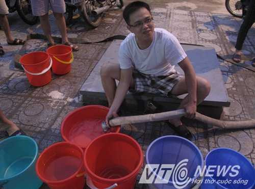 Suốt từ ngày 10/5 đến nay, anh Tiệp (ở tầng 15 của tòa nhà CT8B - khu chung cư Đại Thanh) phải liên tục đi túc trực để hứng nước, hoặc vất vả hơn thì mang xô đi xin nước của những khu dân cư xung quanh.