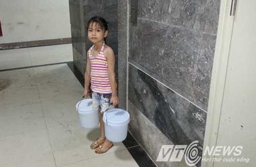 Bố đi làm cả ngày nên em bé này ở tòa CT8B của khu đô thị Đại Thanh cũng phải đi xách nước về sinh hoạt |
