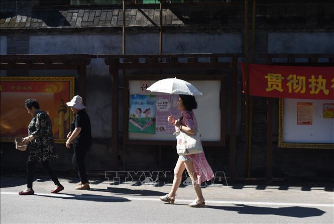 Người dân dùng ô che nắng ở Bắc Kinh, Trung Quốc. (Ảnh: AFP/TTXVN)