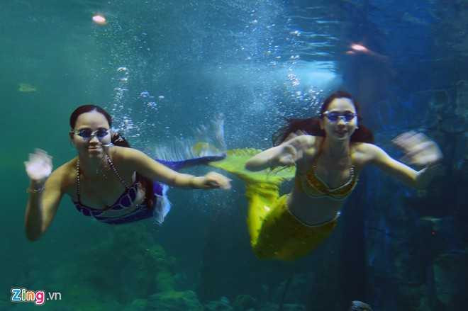 | Tại thủy cung lớn nhất thủ đô khai trương ngày 24/12/2013, khán giả ngỡ ngàng khi thấy sự xuất hiện của "người cá" tung tăng bơi lội. Đó là các cô gái trẻ, là sinh viên hoặc vừa tốt nghiệp đại học có nhu cầu làm thêm mỗi buổi. |