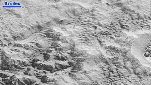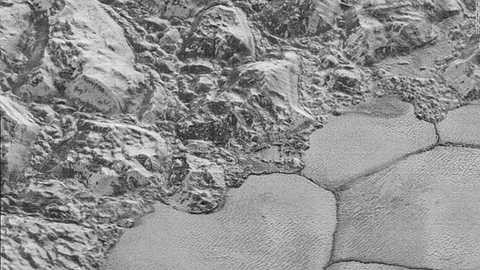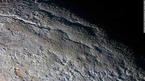 | Trong bức ảnh có độ phân giải cao được chụp từ phi thuyền New Horizons của Cơ quan Hàng không Vũ trụ Mỹ (NASA), các lớp vỏ dày khối băng dường như ép chặt lấy nhau ở khu vực dãy núi al-Idrisi, CNN đưa tin ngày 5/12. Dãy núi này bao quanh cánh đồng băng khổng lồ Sputnik Planum. |