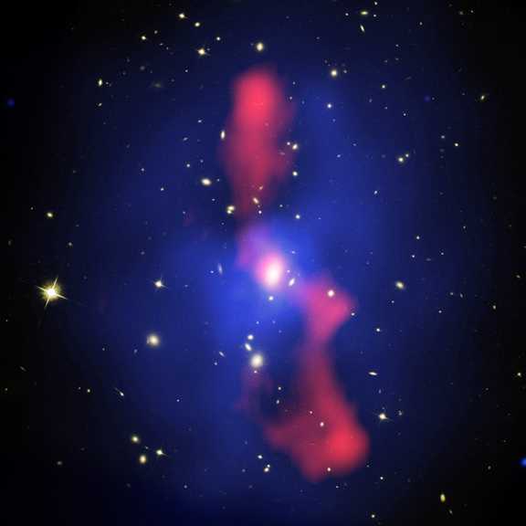 Diffuse, một loại khí nóng với nhiệt độ gần 50 triệu độ tỏa ra trong không gian giữa các thiên hà. Các khí đó đồng thời phát ra tia X, tia màu xanh trong hình ảnh, được chụp từ đài quan sát Chandra X-ray.
