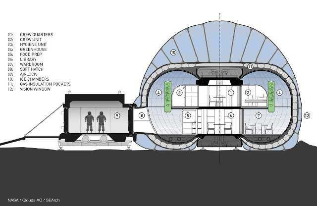 Kiến trúc có đầy đủ các phòng chức năng phục vụ cuộc sống sinh hoạt của các nhà du hành.