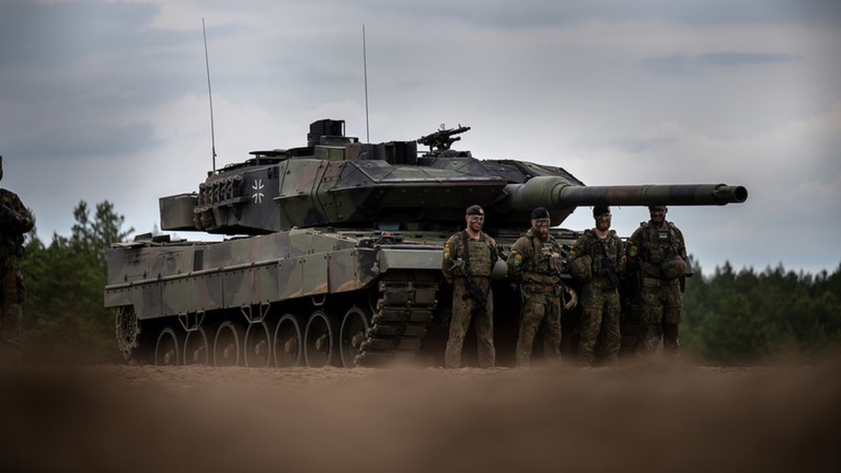 Các binh sĩ đứng trước xe tăng Leopard-2 của quân đội Đức.