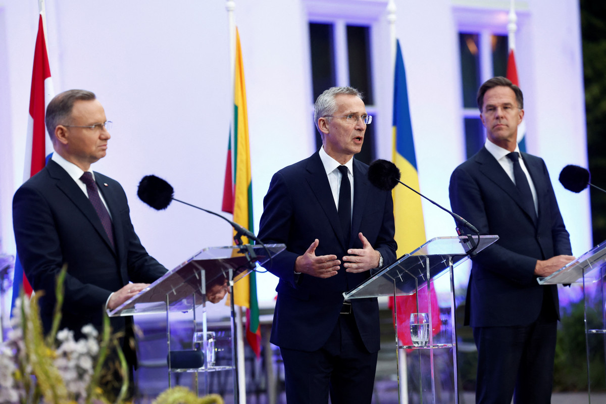 Tổng thư ký NATO Jens Stoltenberg (giữa) cùng Tổng thống Ba Lan Andrzej Duda và Thủ tướng Hà Lan Mark Rutte trong cuộc họp báo sau hội nghị ở Hague, Hà Lan ngày 27/6. (Ảnh: Reuters)