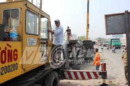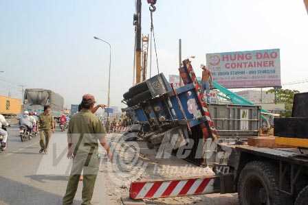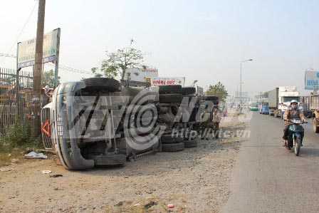 Do thắng gấp, lại chạy với tốc độ cao khiến công hàng phía sau nghiêng về một bên, chiếc xe loạng choạng rồi lật nhào xuống đường. Tài xế bị kẹt cứng trong cabin được người dân mở cửa đưa ra ngoài trong tình trạng hoảng loạn.