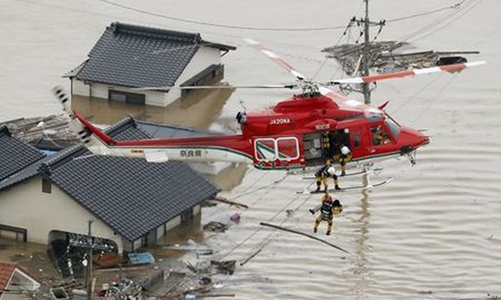 Tại một số điểm khó tiếp cận bằng đường bộ, Nhật Bản điều động trực thăng và xuồng cứu hộ tới giải cứu người dân bị mắc kẹt trong những ngôi nhà ngập trong biển nước hay tại các khu vực bị lở đất nghiêm trọng.