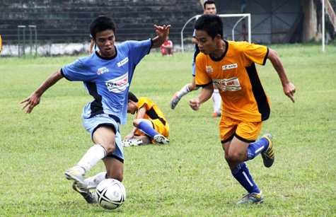 Văn Thuận (bên trái) mở tỷ số trận đấu trên chấm 11m cho CĐ Đức Trí (Ảnh: Hà Thành)