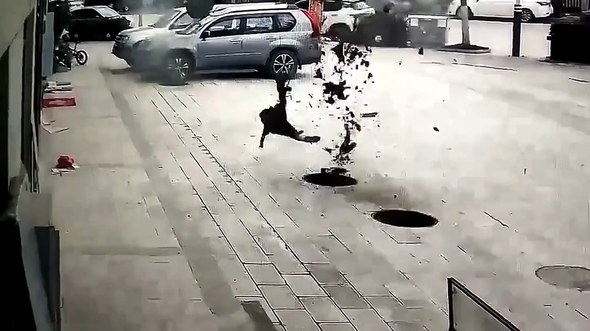 Một bé trai ở Trung Quốc đã ném que diêm xuống cống thoát nước gây nổ, bị hất tung lên không trung khiến người xem sợ hãi.
