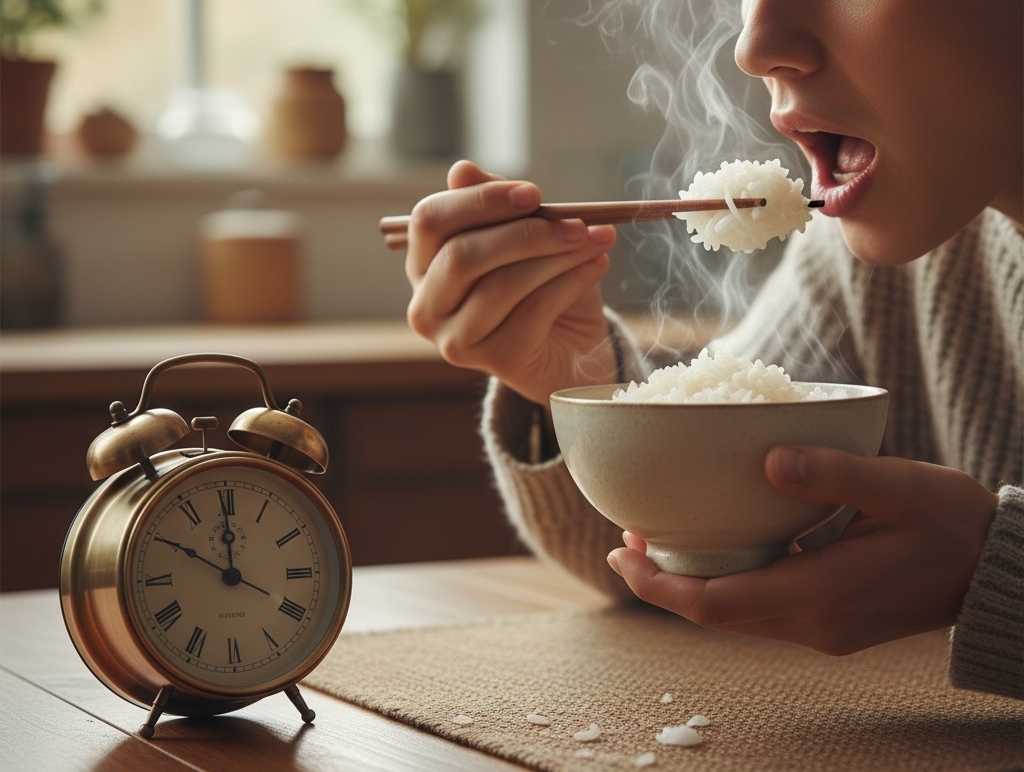 Ăn sáng đúng giờ với cơm nóng mới nấu giúp tăng năng lượng, cải thiện trí nhớ, giảm nguy cơ bệnh dạ dày và thiếu dưỡng chất.