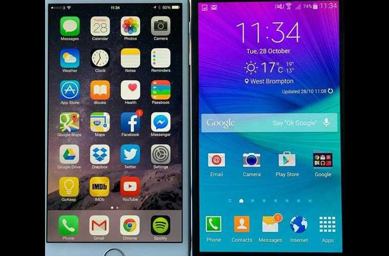 iPhone 6 Plus sử dụng màn hình IPS trong khi màn hình của Note 4 là màn hình AMOLED.