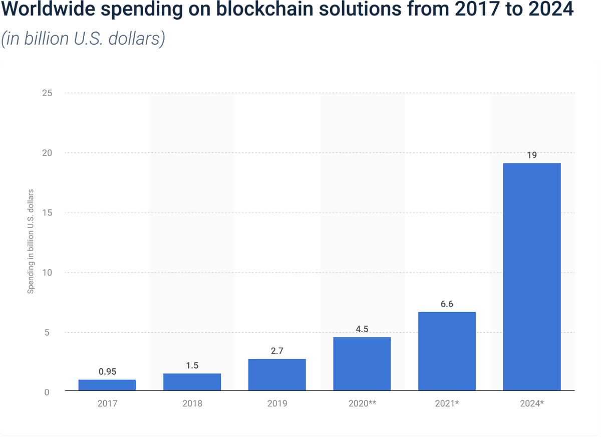 Báo cáo mới nhất của IDC ghi nhận mức chi tiêu cho các giải pháp blockchain trên toàn cầu trong năm 2020 là 4,5 tỷ USD, tăng 50% so với năm trước đó - lúc đại dịch COVID-19 chưa bùng phát. Các chuyên gia của IDC cũng ước tính, chi tiêu năm 2021 sẽ đạt 6,6 tỷ USD với tỷ lệ tăng trưởng kép trong 5 năm là 48% mỗi năm. Đồng nghĩa sẽ có gần 19 tỷ USD đổ vào thị trường này trong năm 2024.