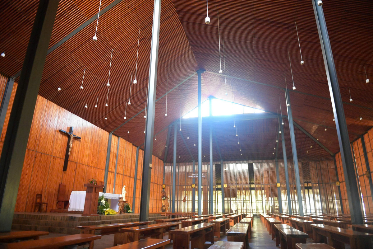 Hệ thống tường bao và trần nhà là hệ thống thanh gỗ thông xếp song song nhau nên vẫn tạo được không gian linh thiêng, thoáng rộng nhưng gần gũi.