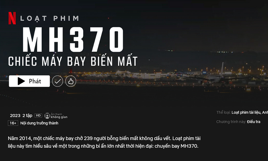 Bộ phim tài liệu "MH370, chiếc máy bay biến mất" phát sóng trên nền tảng Netflix, do Raw TV sản xuất, nói về vụ mất tích bí ẩn của chuyến bay mang số hiệu MH370 của hãng hàng không Malaysia năm 2014. Phim nhận được đánh giá 6/10 của các khán giả trên trang đánh giá phim IMDb, 86% trên trang Rotten Tomatoes và 1,7/5 trên Google.