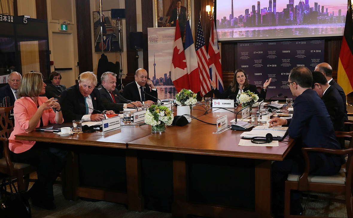 Các ngoại trưởng G7 kêu gọi Nga "chấm dứt các hành động thiếu trách nhiệm và gây mất ổn định ở nhiều khu vực trên thế giới khi Matxcơva cho thấy chưa có ý định dừng việc can thiệp vào hệ thống dân chủ của nhiều nước khác nhau". Nhóm này cũng cho rằng các hành động này có tác động tiêu cực đến triển vọng hợp tác xây dựng với Nga.