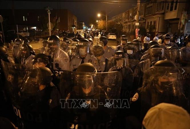 Cảnh sát được triển khai để ứng phó với biểu tình bạo loạn tại khu vực giữa giao lộ 55 và phố Pine, thành phố Philadelphia, Mỹ ngày 26/10/2020. (Ảnh: Inquirer/TTXVN)