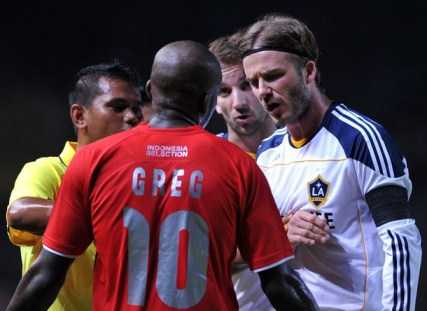 | Greg Nwokolo là một trong số rất nhiều cầu thủ Indonesia ghi dấu ấn mạnh mẽ trước Beckham và các đồng đội. |
