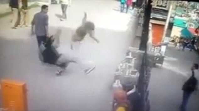 Khi con khỉ đang yên vị trên tường thì gã thanh niên đi qua, giơ ngón tay lên như để 'khiêu khích' con khỉ và phải lãnh hậu quả.