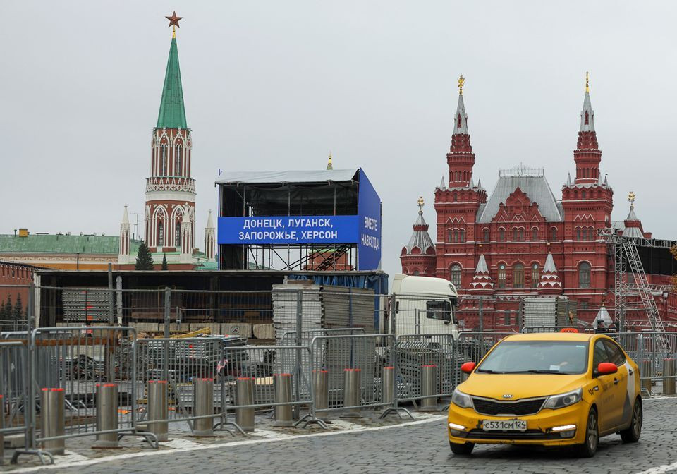 Trên Quảng trường Đỏ, một khán đài với màn hình video khổng lồ đã được dựng lên, với các biển hiệu ghi "Donetsk, Luhansk, Zaporizhzhia, Kherson - Nga!"