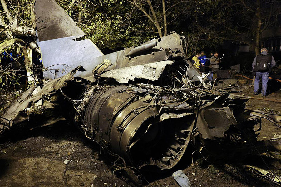 Phần còn lại của chiếc Su-34 sau khi lao vào tòa chung cư ở thành phố Yeysk ở miền Nam nước Nga. (Ảnh: TASS)