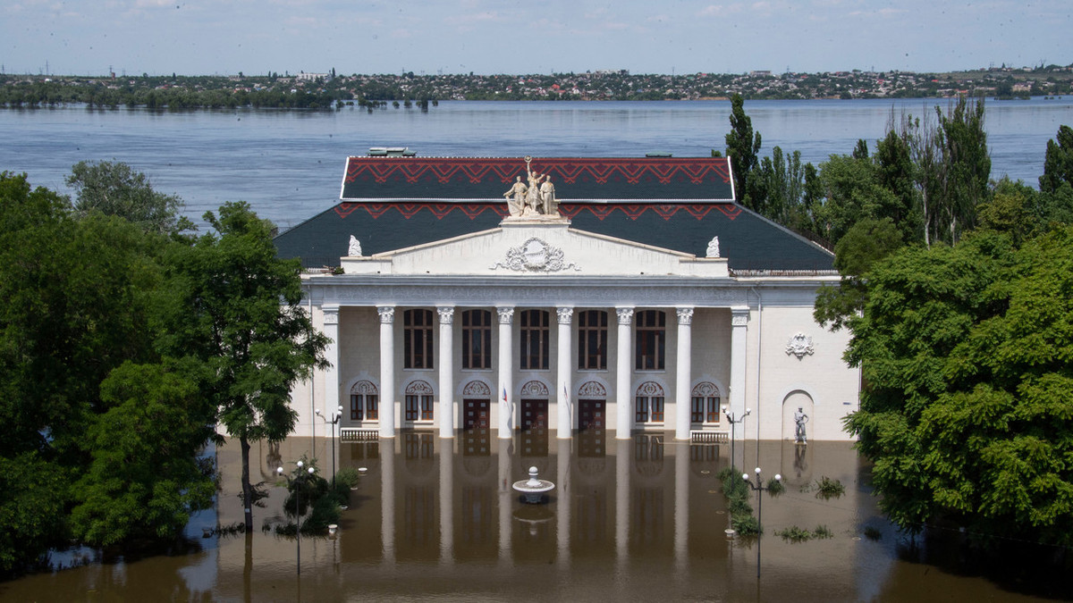 Một tòa nhà ở thành phố Kherson ở bờ tây sông Dnieper bị ngập lụt sau vụ vỡ đập Kakhovka. (Ảnh: RT)