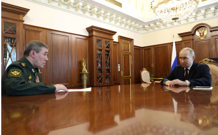 Tổng thống Nga Vladimir Putin gặp Tổng tham mưu trưởng Lực lượng vũ trang Nga Valery Gerasimov tại Moskva, ngày 19/4. (Ảnh: Sputnik)