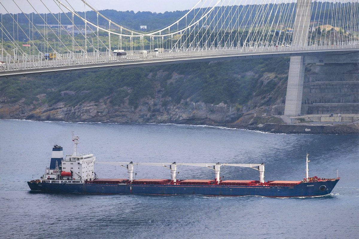 Một tàu chở ngũ cốc Ukraine đi qua eo biển eo biển Bosphorus ở Istanbul vào đầu tháng 8/2022. (Ảnh: AP)