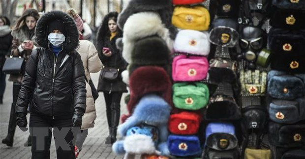 Người dân đeo khẩu trang phòng lây nhiễm dịch COVID-19 trên một đường phố ở Moskva, Nga. (Nguồn: TTXVN)