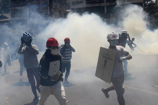 Người biểu tình Myanmar né hơi cay của cảnh sát trong cuộc biểu tình ngày 1/3. (Ảnh: AP)