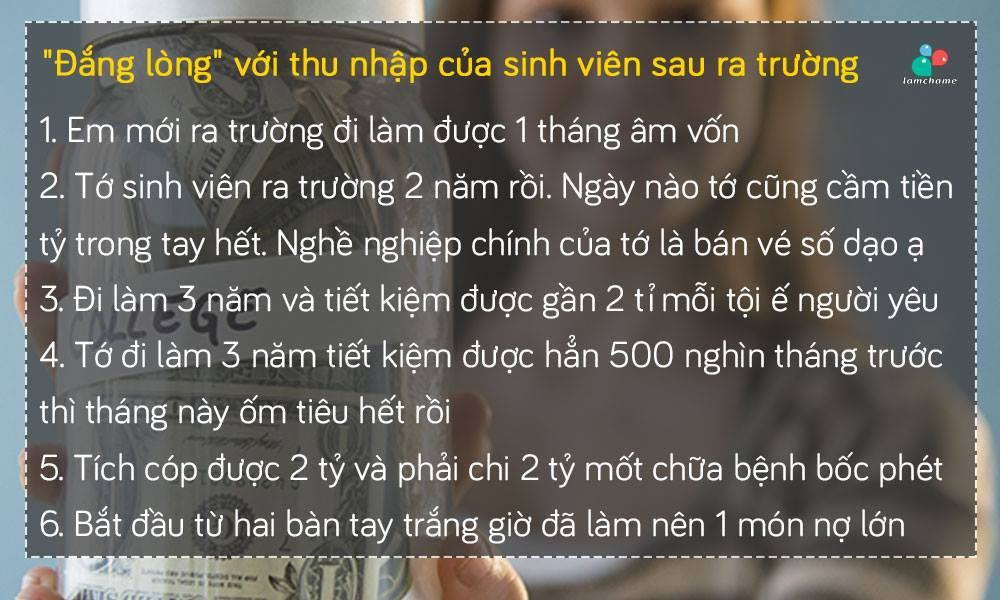 Bạn T.L đã ra trường 2 năm bày tỏ quan điểm: "Nếu lương mình chỉ 5-7 triệu sau 2 năm ra trường thôi chị mình nghĩ các bạn nên làm thêm nghề tay trái nữa. Ví dụ như buôn bán online, kinh doanh đồ khô, viết bài thuê,...Như vậy, lương chính đủ ăn tiêu rồi, còn lương phụ để tiết kiệm.