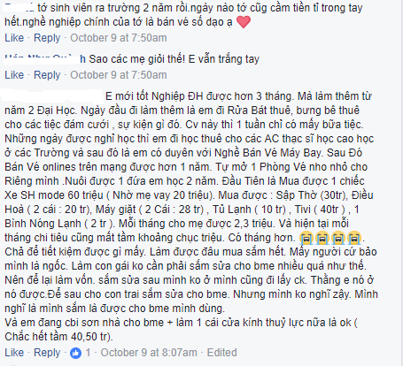 Bạn A.T.B comment: “2 năm đầu mình làm tiếp viên hàng không. Lương mỗi tháng xấp xỉ 30 triệu. Gần 2 năm mới để được 500 triệu. 1 năm sau mình đi làm giáo viên tiếng Anh, 5 tháng đầu cũng chỉ 40 triệu thôi. 8 tháng sau mỗi tháng 150-200 triệu/tháng. Giờ mình có hơn 1 tỷ rồi.”