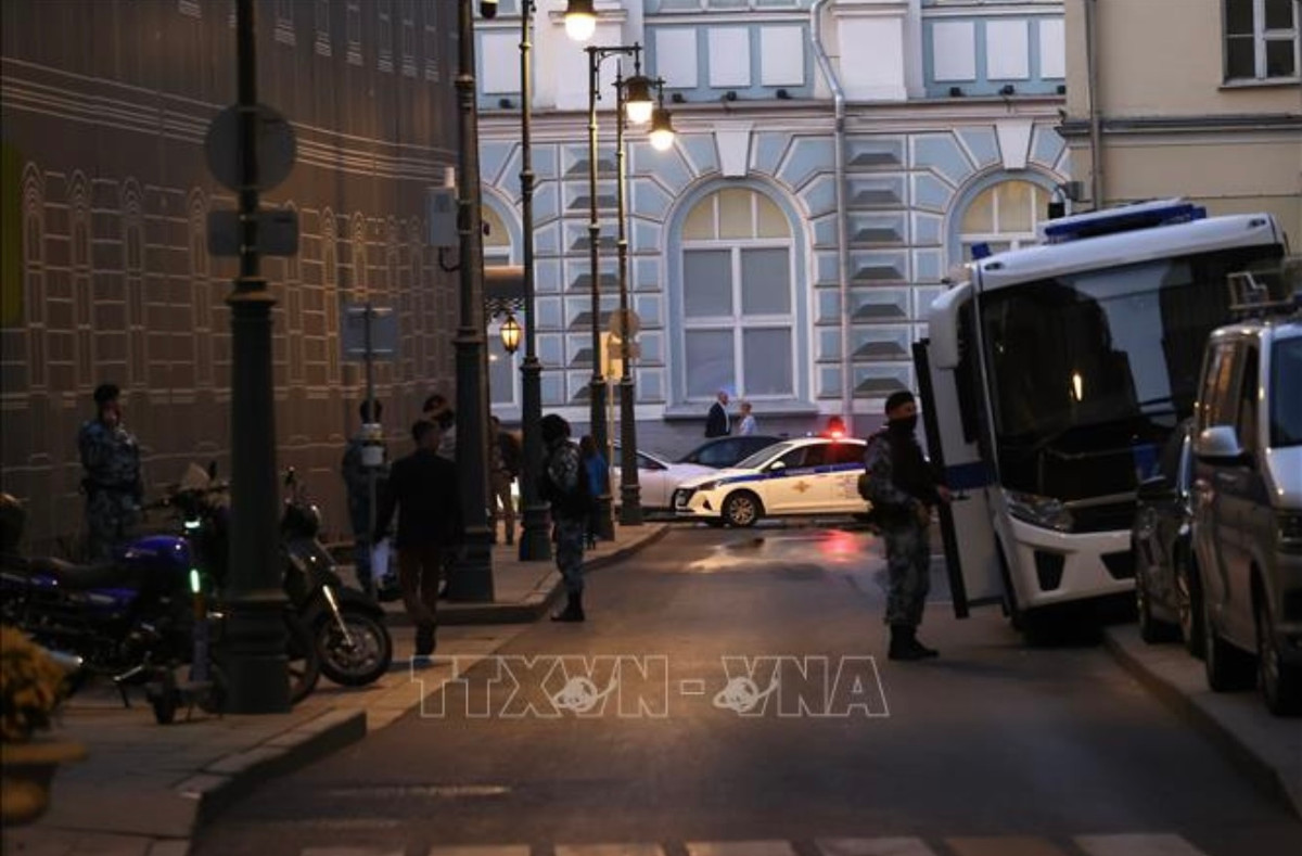 Cảnh sát gác gần hiện trường vụ nổ súng ở Moskva, Nga ngày 18/9/2024. (Ảnh: THX/TTXVN)