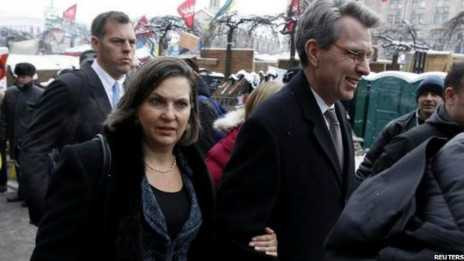 Bà Nuland cùng Đại sứ Pyatt trong chuyến thăm Kiev tháng 12/2013 (Nguồn: Reuters)