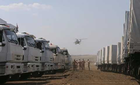 | Đoàn xe cứu trợ Nga đậu ở vùng Kamensk-Shakhtinsky, gần Rostov hôm 14/8 |