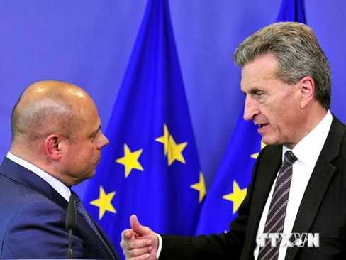 | Cuộc gặp giữa Ủy viên Hội đồng EU phụ trách về Năng lượng Gunther Oettinger (phải) và Bộ trưởng Năng lượng Ukraine Yuriy Prodan (trái) |