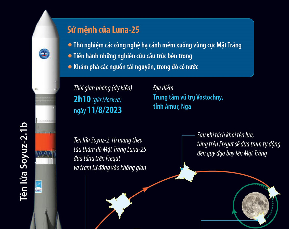 Nga dự kiến sẽ phóng tàu thăm dò Mặt Trăng Luna-25 vào ngày 11/8, đánh dấu bước khởi động lại chương trình thăm dò Mặt Trăng của Nga sau gần 50 năm.