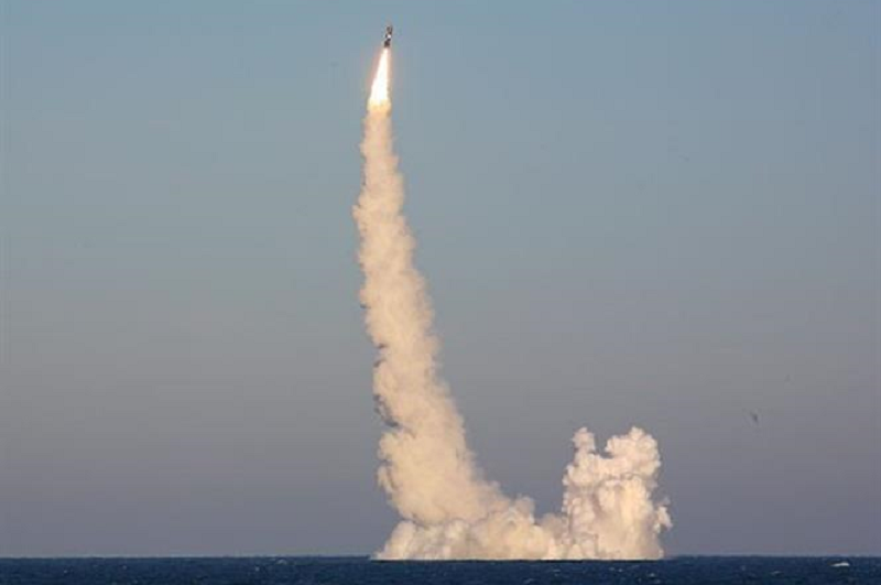 Tên lửa đạn đạo Bulava được phóng từ tàu ngầm hạt nhân Generalissimus Suvorov của Nga trên Biển Trắng, ngày 3/11/2022. Ảnh tư liệu: Kurir/TTXVN