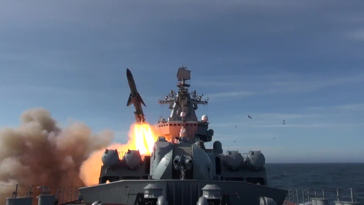 Tàu tuần dương Varyag của Nga phóng tên lửa hành trình chống hạm P-1000 Vulkan trong một cuộc tập trận. (Ảnh: Bộ Quốc phòng Nga)