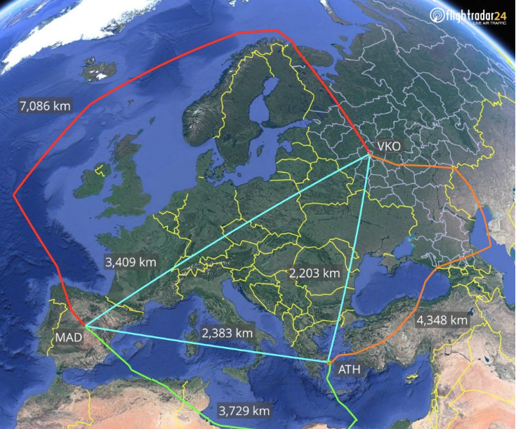 Trong chặng đầu tiên từ Moskva tới Tây Ban Nha, máy bay Nga phải bay đường vòng để tránh các không phận bị cấm. Chuyến bay này kéo dài 7.086 km so với 3.409 km thời điểm thông thường.