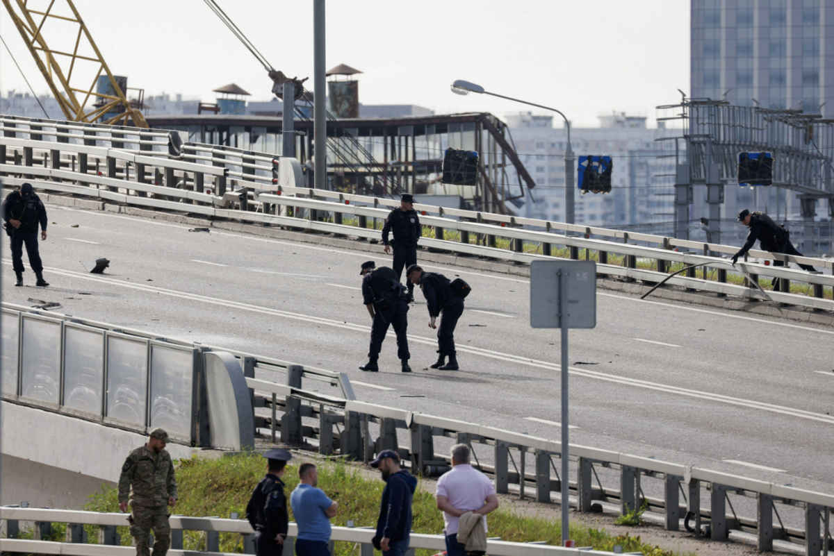 Cơ quan an ninh thu thập các mảnh vỡ khi điều tra gần địa điểm của một tòa nhà bị hư hại sau vụ tấn công bằng UAV ở thủ đô Moskva ngày 24/7. (Ảnh: Reuters)