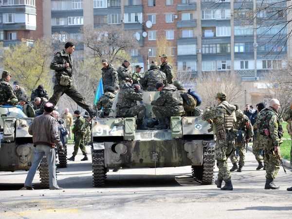 | Xe bọc thép của một nhóm vũ trang chưa rõ thuộc lực lượng nào trấn giữ bên ngoài một tòa nhà chính quyền ở thành phố Slavyansk ngày 16/4 |