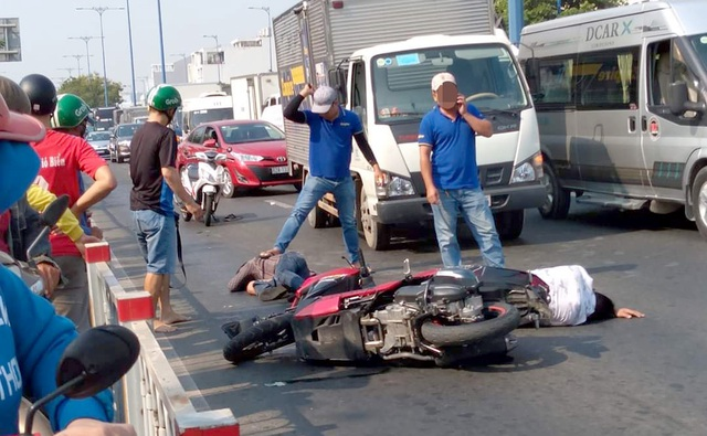 Khi đến cầu bộ hành số 6, đường Võ Văn Kiệt, chiếc xe chở 2 thanh niên đổ xuống đường, khiến họ bị chấn thương nặng, được người dân đưa đi cấp cứu. Những người chứng kiến cho biết 2 nạn nhân này vừa cướp giật túi xách ở quận 10, bị truy đuổi đến địa điểm trên thì tự ngã.