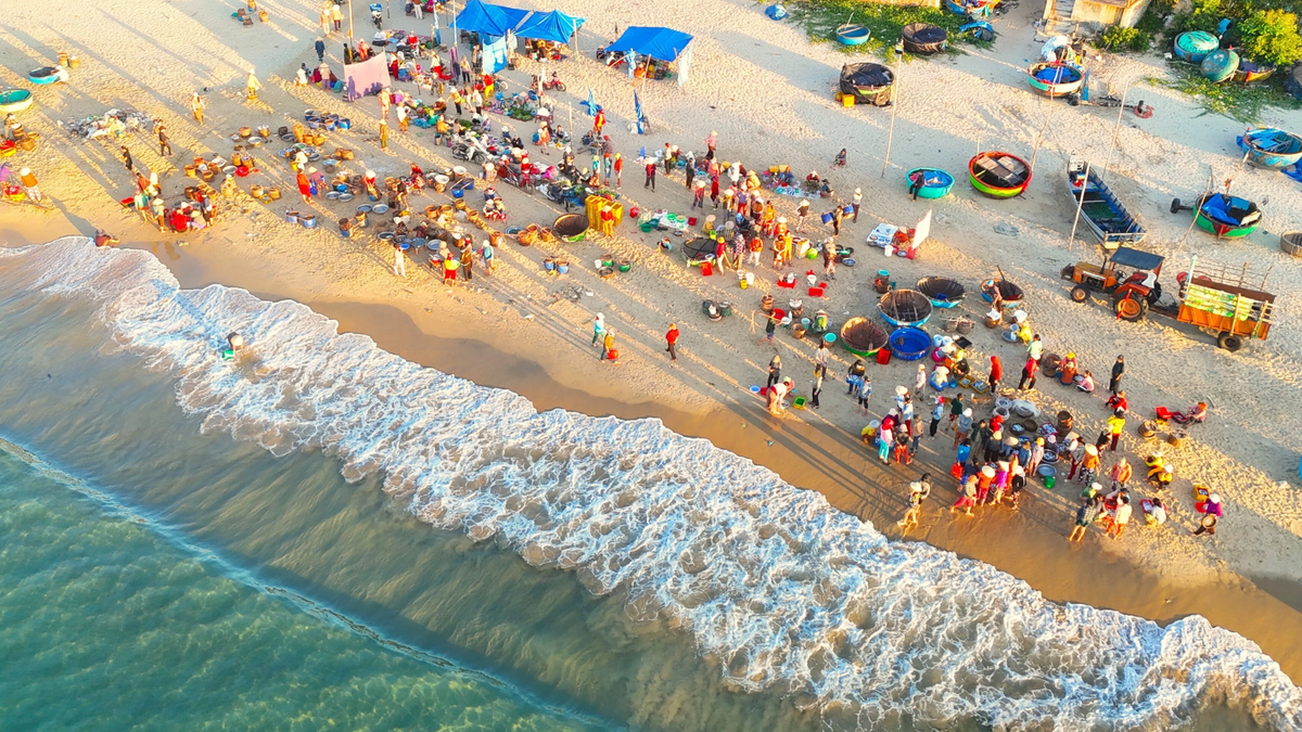 Bình minh vừa ló dạng, chợ cá ven biển tại làng chài xã Mỹ An (Phù Mỹ, Bình Định) đã sôi động bởi tiếng í ới gọi nhau khi các tàu khai thác hải sản đã về bờ.