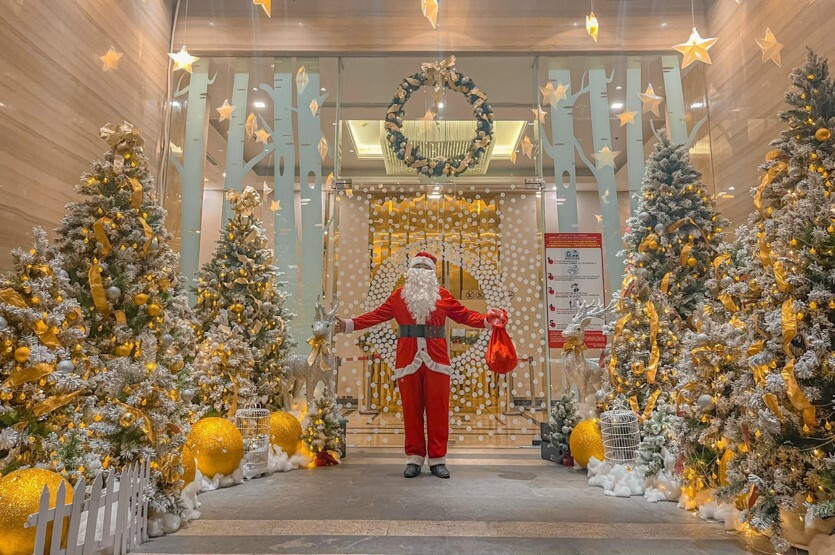 “Ông già Noel” tại sảnh Aqua 1 Vinhomes Golden River được trang hoàng bởi cư dân.