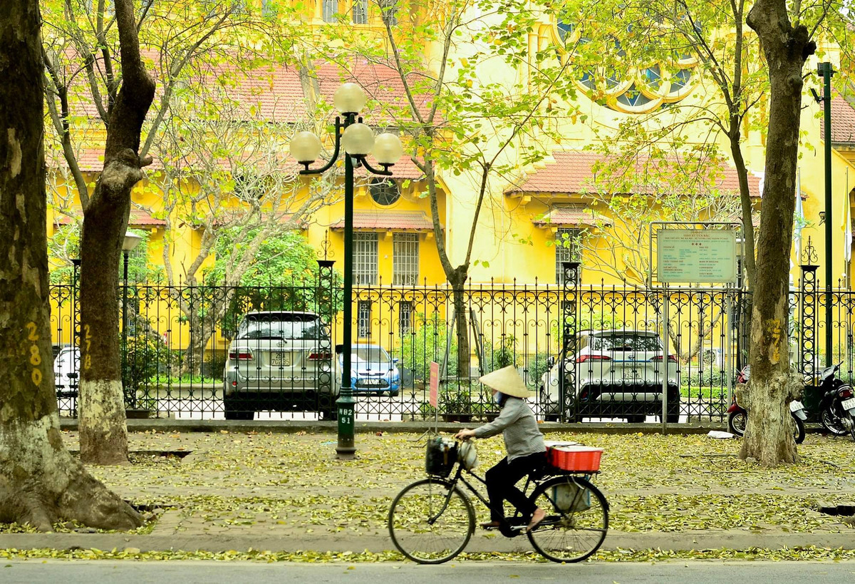 Những lớp lá vàng từ cây sấu cổ thụ rụng rơi đầy khắp hai bên vỉa hè trên con phố Phan Đình Phùng.