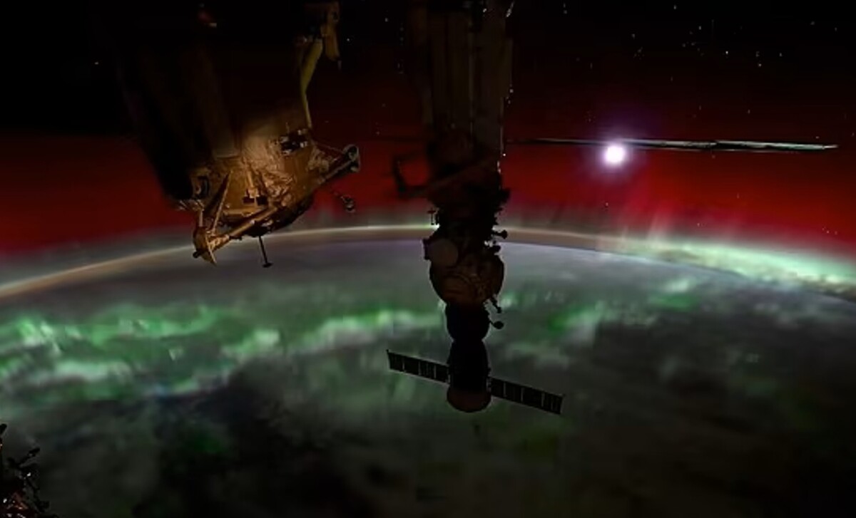 "Video tua nhanh cảnh mặt trăng lặn xuống những dải cực quang đỏ và xanh lá cây, tiếp theo là cảnh mặt trời mọc chiếu sáng tàu Soyuz bằng ánh sáng xanh nhạt", ông Dominick viết trong chú thích video mới nhất của mình.