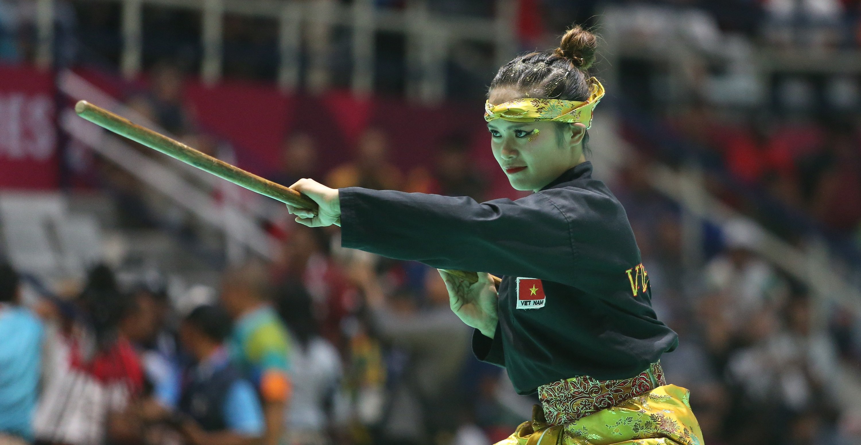 Giống như bài thi đồng đội 3 người, 2 đả nữ của Pencak Silat Việt Nam khiến các khán giả chủ nhà vỗ tay rần rần với bài biểu diễn đẹp mắt, vừa mạnh mẽ vừa duyên dáng.